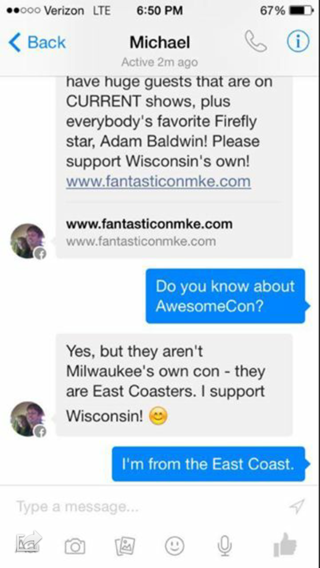 Fantasticon didn’t start there though. The summer prior, Fantasticon’s convention chair was directly contacting people stating they were interested in going to Awesome Con Milwaukee telling them not to attend the other show via Facebook.