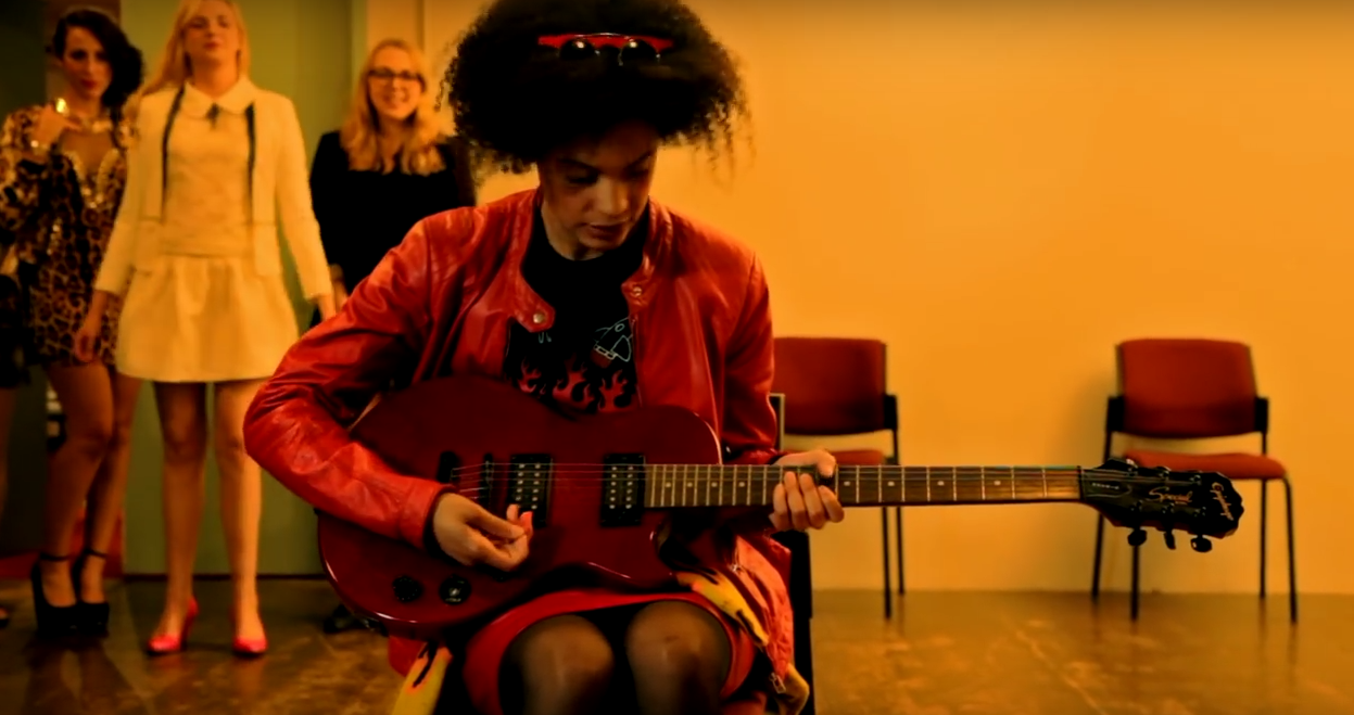 Alba then auditions for the band. This is kind of confusing, because, y’know, she’s not even pretending to be a student like Lara. During Alba’s audition, Teela sneaks backstage and cuts loose the cursed guitar.