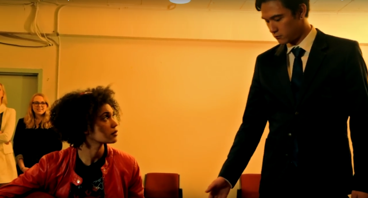 After playing a little, he immediately leaves – saying he’s just there to “scope out the competition.” You know, it’s not really clear who they’re auditioning for. Moe, Lara, Alba and Jason are all sitting behind the table. Lara’s auditioning theoretically. Alba isn’t a student and Moe isn’t in the band.