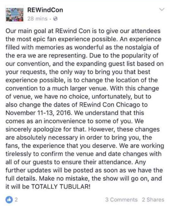 That second statement matches closely to the one we received from Katz Public Relations on behalf of Rewind Con back in June (we were asking if preregistered attendees would get refunds at the time). But while the con’s staff seemed to be pointing at venue size, the ongoing rumors surrounding the con have been that they were unable to pay their original hotel. We haven’t been able to confirm that, though it wouldn’t be the first time a convention moved because they couldn’t pay their bill. In any case, size doesn’t seem to have actually been a factor in Rewind Con’s move.